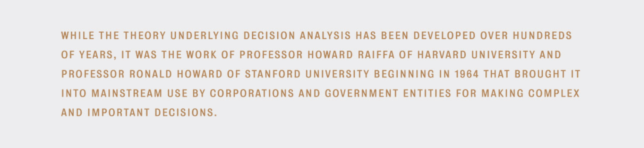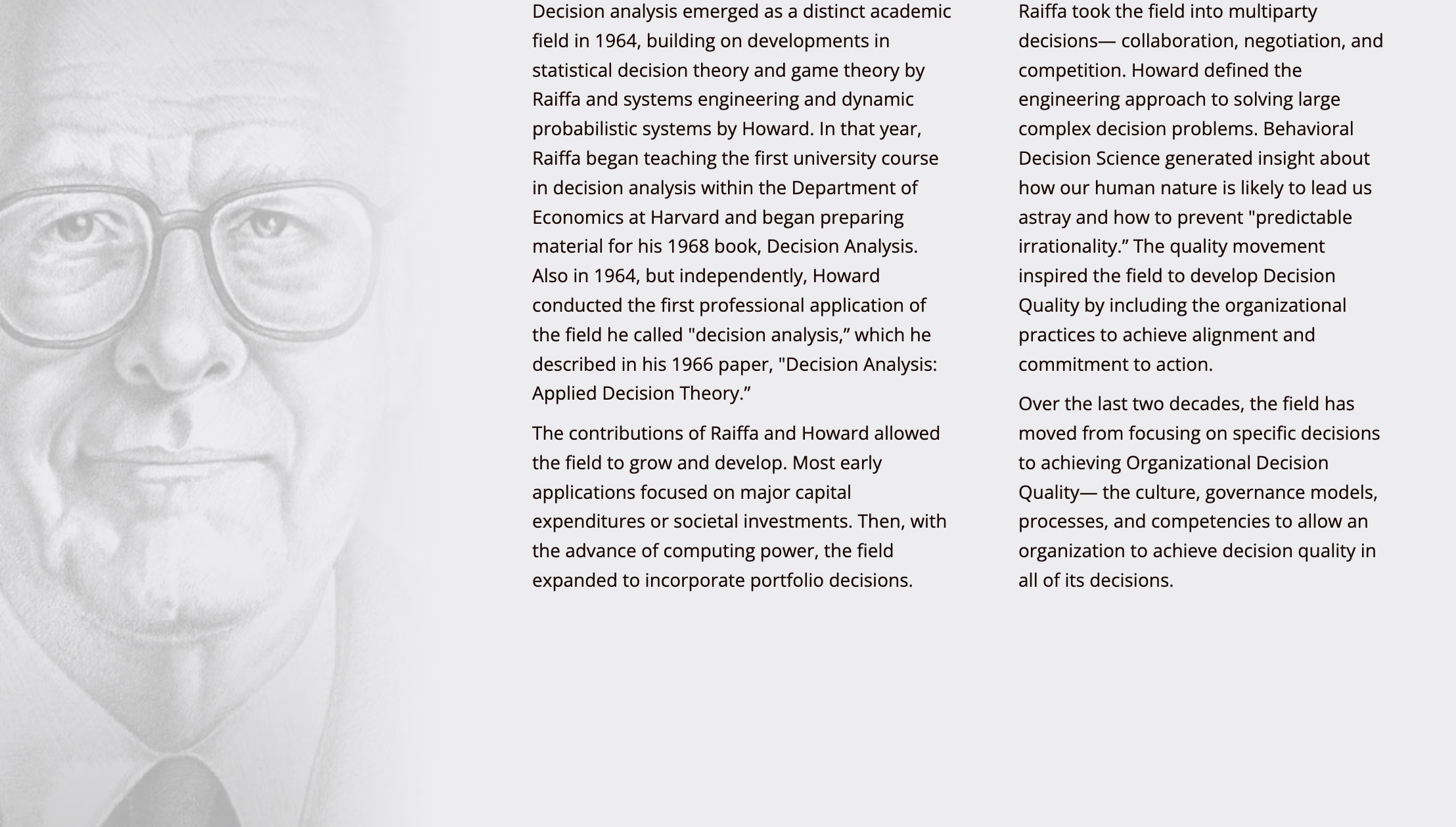 The Society of Decision Professionals created the Raiffa-Howard Award for Organizational Decision Quality to recognize this anniversary of DA, to honor the founders, and to advance the appreciation of DA and Decision Quality.